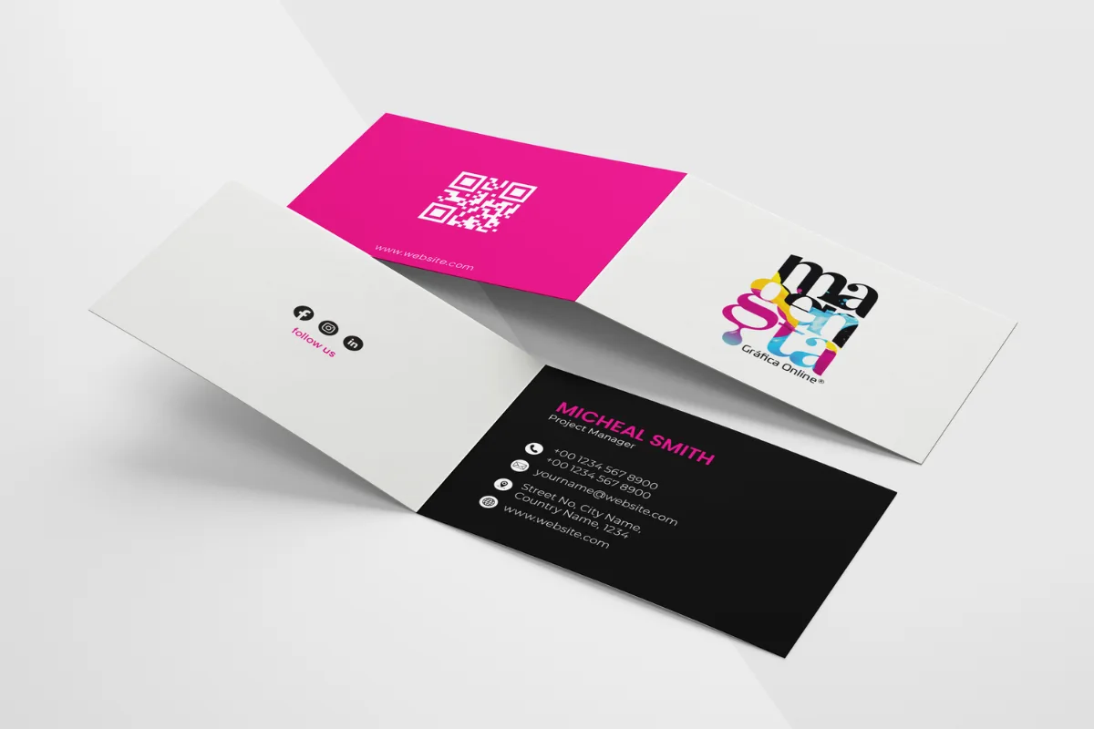 O cartão de visita duplo tem dois formatos possíveis (horizontal e vertical). É impresso na frente e verso, a cores. Dê um toque personalizado com plastificação veludo.